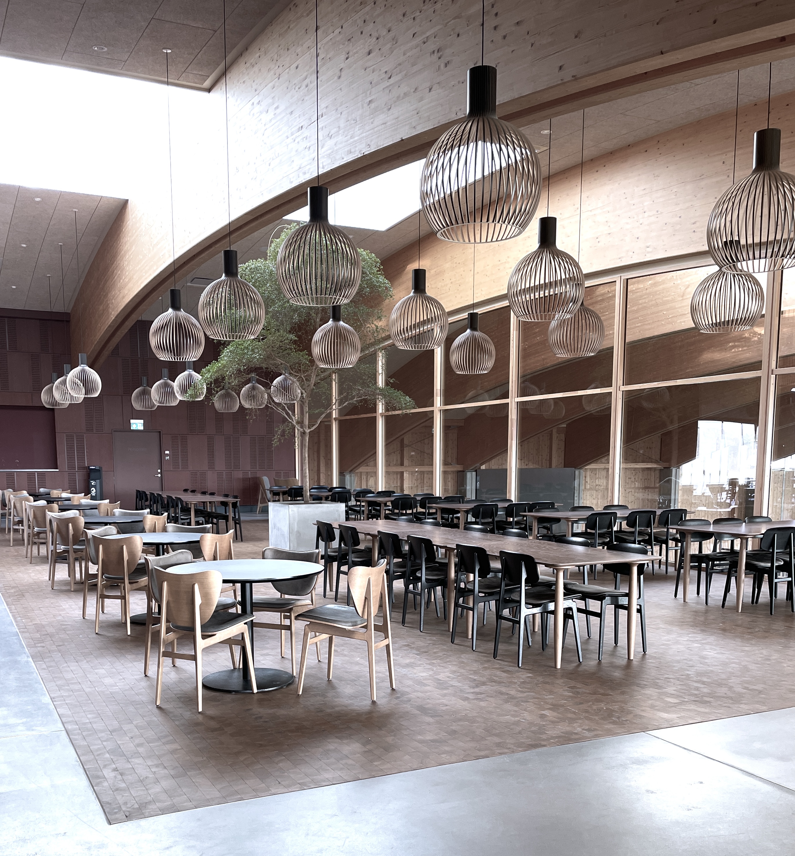 Hos Stutteri Ask er indretningen, ligesom arkitekturen, i pagt med naturen. Ridesadlens organiske form træder frem på loungestolenes rygge og barstolenes sæder. Landskabet er trukket med indendøre hvor trætoppe skyder mod loungens loft.